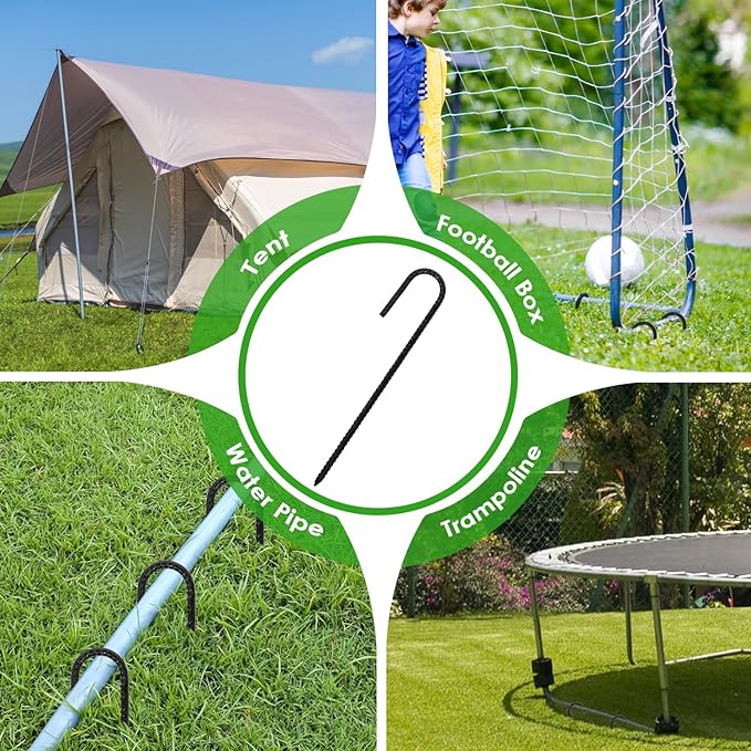 • MULTIFUNCTIONAL J HOOK REBAR GROUND STAKES -- Rebar ground stakes can help you fix fences, swing frames, playground football nets, tents, ground anchors, garden decorations and so on, so that the tent or shed will not be blown down by the wind. Moreover, the rebar stake is light in size and easy to carry, bringing more possibilities to your life.