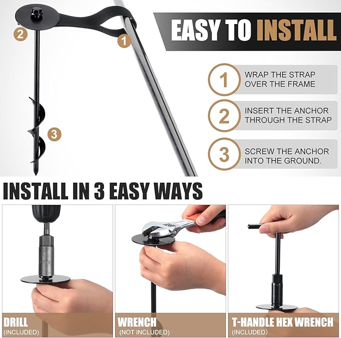 • Easy to Install: no complicated instructions or a hundred parts, the trampoline anchor kit can assemble and disassemble quickly, choose a suitable place, wrap the strap over the frame, insert the anchor through the strap, screw the anchor into the ground, tips: not suitable for soil with hard rocks or heavy roots, as this may cause damage to the anchor or overload of the cordless drill