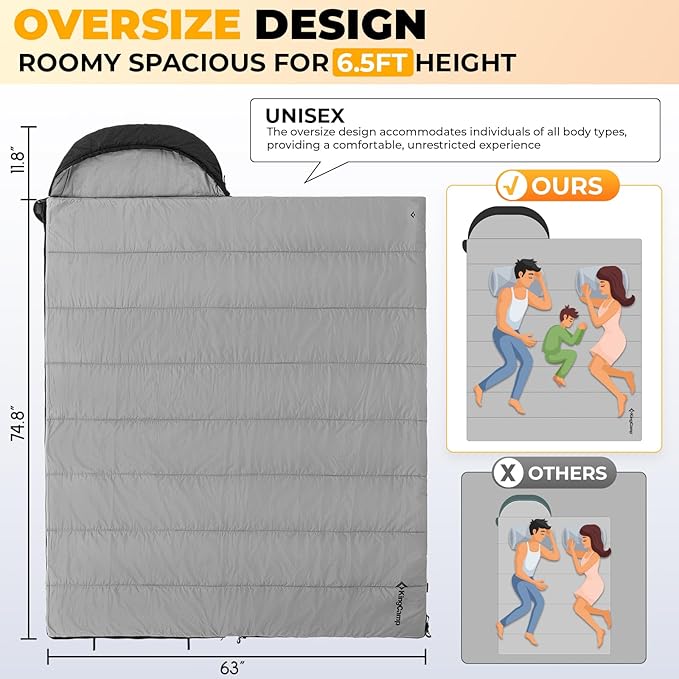• EXTRA LARGE & SPACIOUS-Designed for Big & Tall Individuals: Comfortably fit inside this extra-large sleeping bag, made for adults who need extra room. Measuring generously, it provides ample space for big and tall individuals to move freely. Whether you're camping, hiking, or relaxing outdoors, you'll appreciate the freedom to stretch out, sleep soundly, and enjoy your time in the wilderness without feeling cramped.