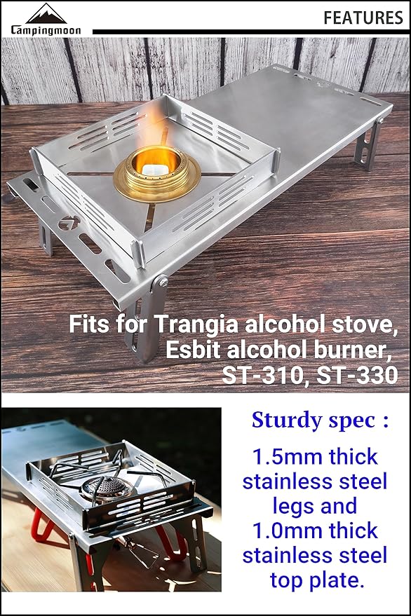 CAMPINGMOON Solo Camping Table Small Tabletop Heat Shield Windshield Stainless Steel Lightweight Compact with Storage Bag for ST-310 Alcohol Stove SK-310CP (Silver)