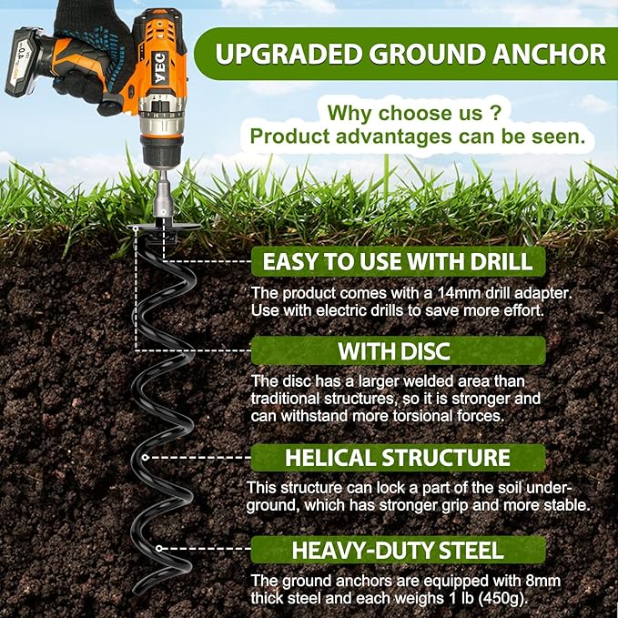 • 【EASY TO INSTALL】A drill machine is recommended, just push the tip into the ground and start the motor until the disc nestles to the ground. You can also use a pole or screwdriver until the screw anchor is fully inserted into the ground.