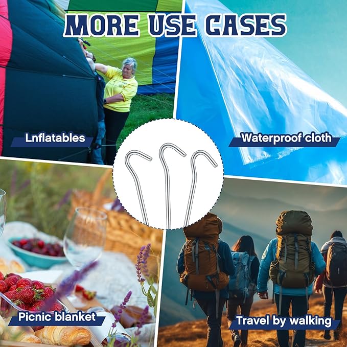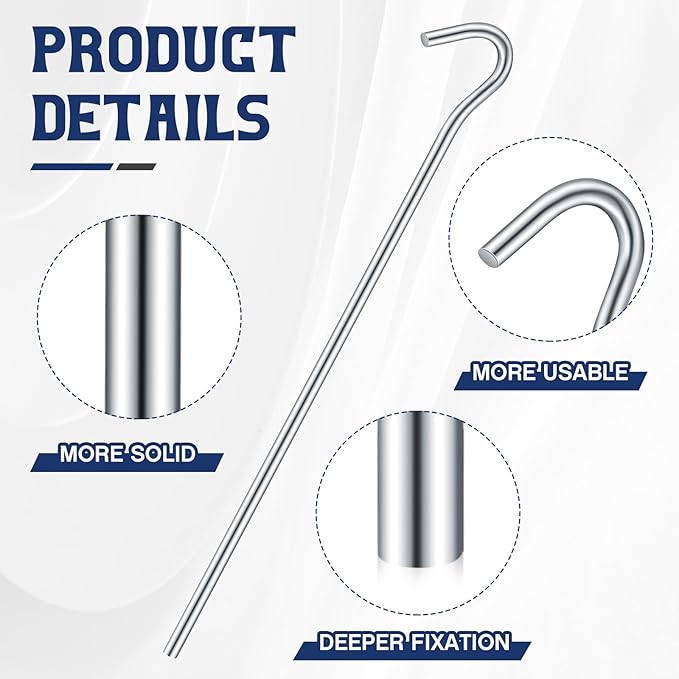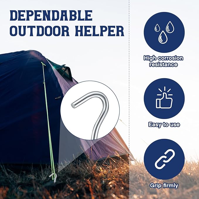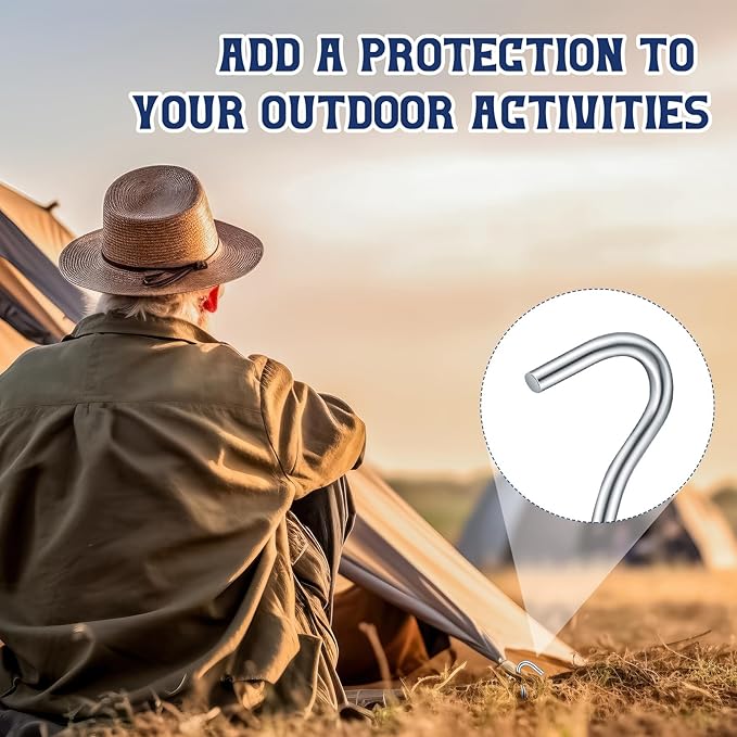 • Easy to Install: the width and length of our ground stakes are designed for easy handling, and the pointed end can drive smoothly into various terrains, deep enough to fix your tent, while the hook end ensures your tent stays firmly in place, helping your tent against the wind, and you can use them multiple times