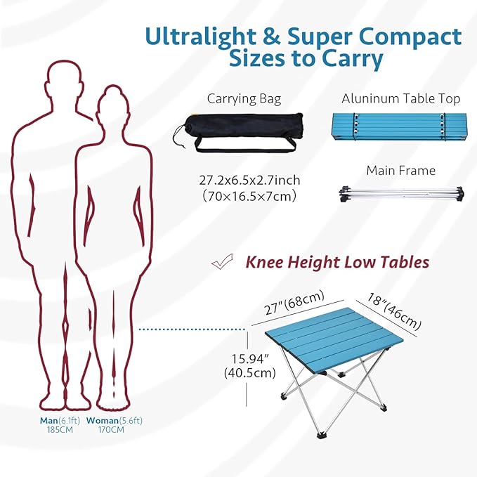 • User-friendly Design ---- Suitable table height for all most camping chairs or stools. Our folding camp table is easy to install, just unfold the aluminum frame, press the two rails into the grooves first, then press the table top into the grooves, and you have a sturdy traveling table. Perfect for drinking coffee at home, as a beach table, or picnic table for cooking and dining.