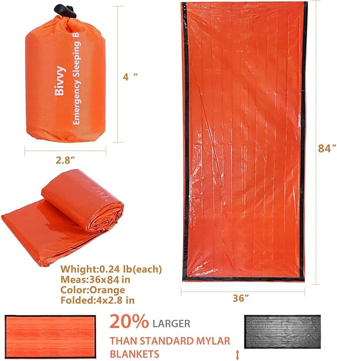 • ✅ FULL BODY PROTECTION SURVIVAL KITS : This thermal Bivvy sleeping bag size is 84 inches x 36 inches = 210 cm x 90 cm/ weight 3.9 oz. in weight, Long enough to cover your full body protection stay warm and alive in extreme weather condition.This emergency sleeping bag easy to carry store in backpacks, first aid kits, camping gear, car drawers or even in your pocket. All individually folded and packaged, well sealed, with excellent water wind proofing and light blocking effects.