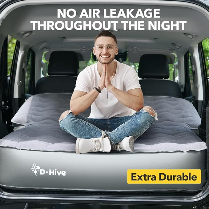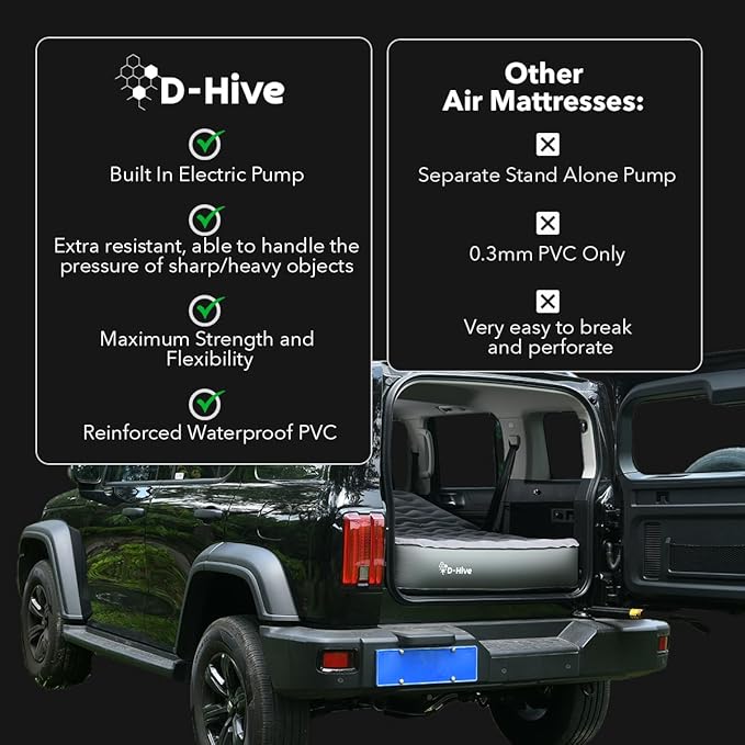 • AIR-TIGHT: Every one of our car mattresses undergoes rigorous testing for a minimum of 72 hours to detect any potential air leakage. Rest assured that D-hive offers a meticulously tested mattress, ensuring uninterrupted nights of sleep without any unexpected air leaks. Proven to have at least 30% less air leakage than common car mattresses.