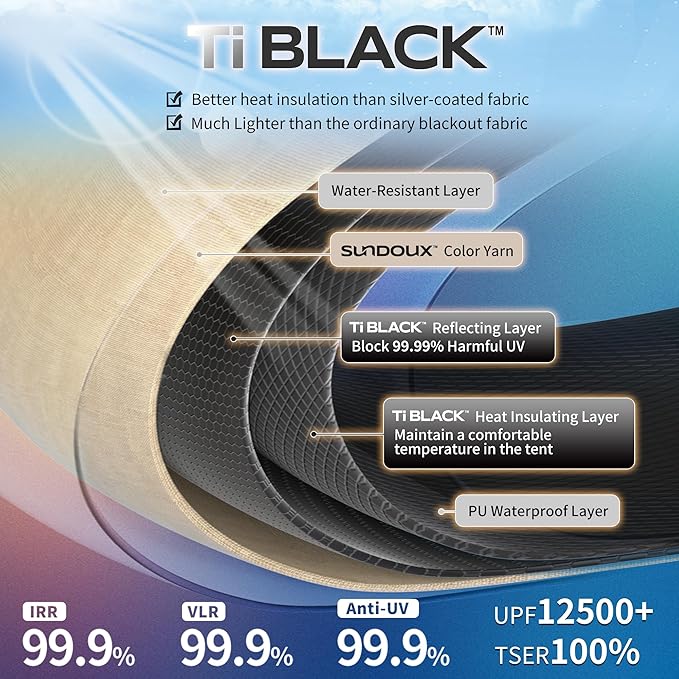 • Blackout Tent: Made of 150D TI BLACK TECHNOLOGY fabric (UPF12500+), which is Better heat insulation than silver-coated fabric, and much Lighter than the ordinary blackout fabric; IRR 99.9%, VLR 99.9%, TSER100%, it helps block 99.9% harmful UV, maintain a comfortable temperature in the tent, you can have a good rest in the tent.