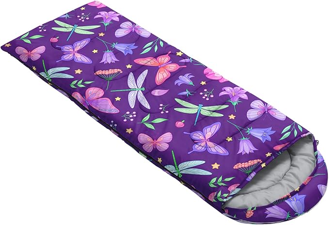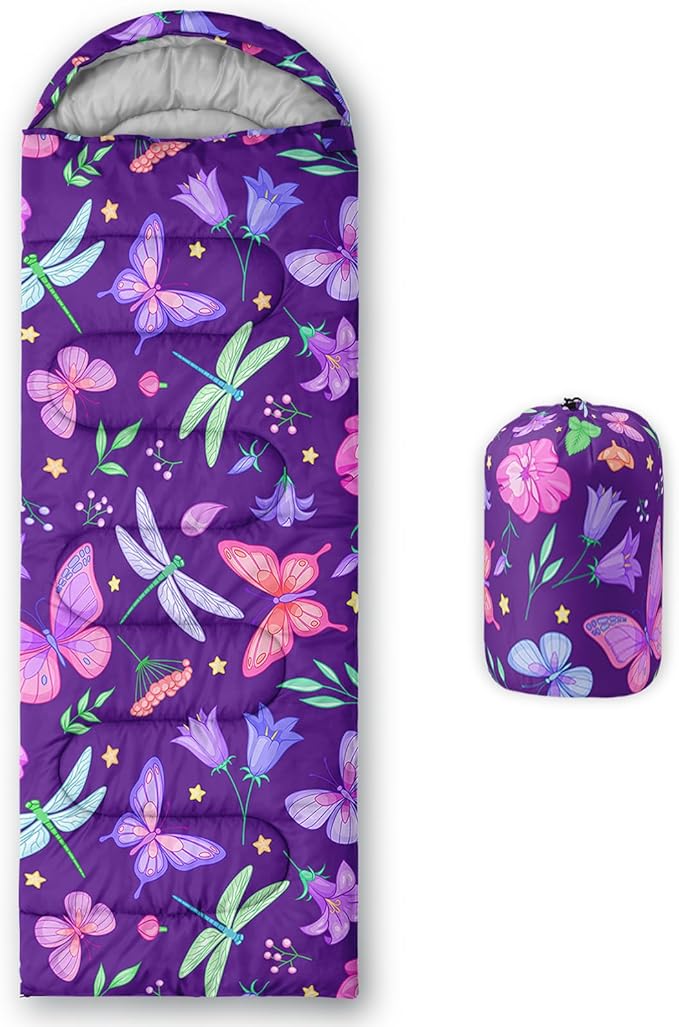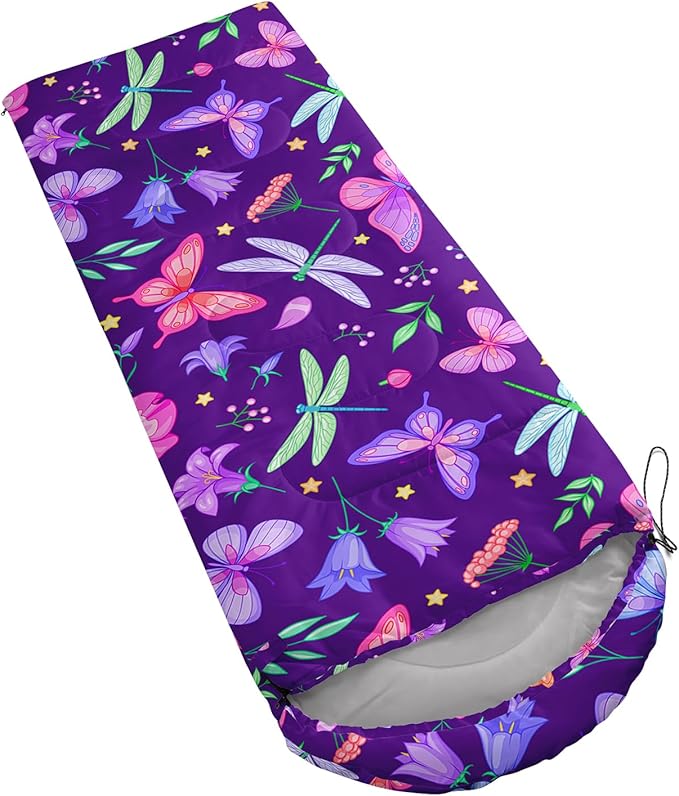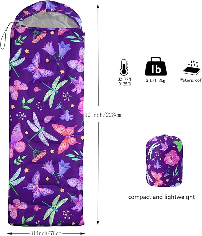 • 【Fits For 3 Seasons】: Size - 31 by 90 inches (W x D). Our Butterfly Print sleeping bag can be used in 3 seasons with a design temperature of 32℉-77℉(0℃-25℃). These Purple flowers bags also have a weather resistant waterproof design to keep you warm and prevent you from any dampness