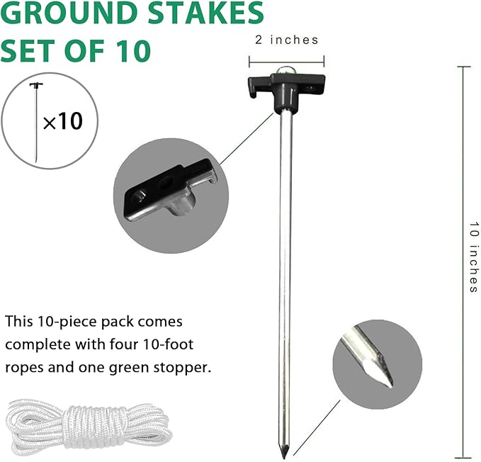 • Comprehensive Set:This 10-piece pack includes four 10-foot ropes and one white stopper, providing everything you need to secure your tent or outdoor shelter.