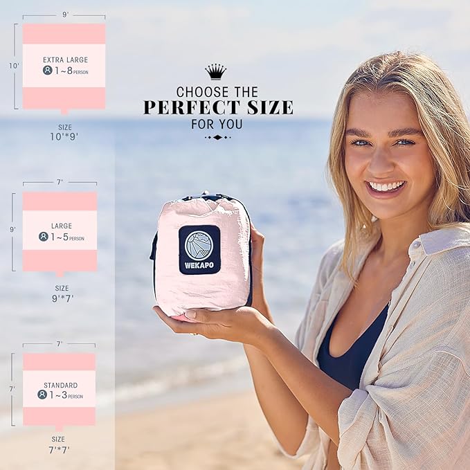 • ✔ SIMPLE DESIGN & DOUBLE ANCHORED-WEKAPO blanket is designed as simple as possible so it has eliminated 5 sticking out sand pockets and added 4 corner pockets that can be used for storage or sand anchor. If it's windy day, it can be nailed down on beach by metal stakes coming with our blanket.