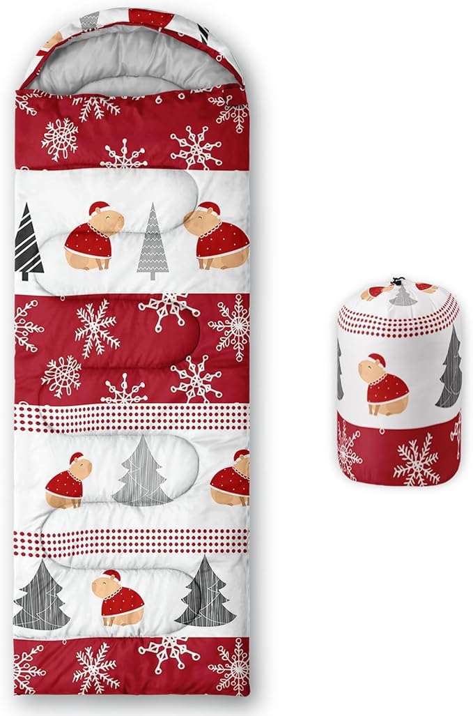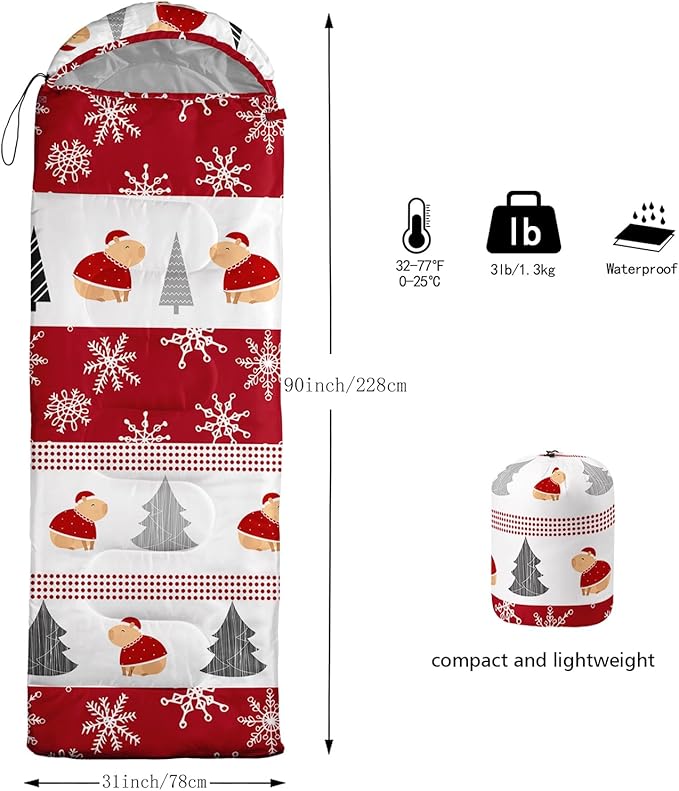 • 【Fits For 3 Seasons】: Size - 31 by 90 inches (W x D). Our Christmas Tree with Snowflakes sleeping bag can be used in 3 seasons with a design temperature of 32℉-77℉(0℃-25℃). These Christmas Capybara bags also have a weather resistant waterproof design to keep you warm and prevent you from any dampness.