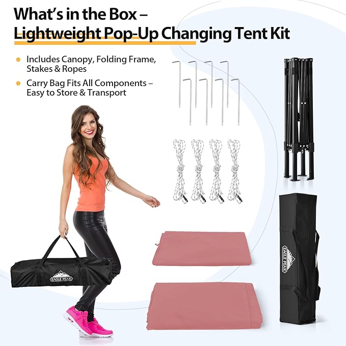 • WHAT’S INCLUDED: Canopy Frame, 140g polyester top fabric, sidewalls with easy-entrance zipper for complete enclosure, 2 hooks to hang clothes, towels etc, a mesh storage pocket, and carry case .