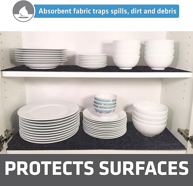 • PROTECTS CABINETS FROM SPILLS, SCRATCHES, DIRT, & DEBRIS: Our Premium Shelf Liner is designed to protect your expensive cabinets from spills, stains, scratches, scuffs, and contain unwanted dirt and debris. VERSATILE USES: Use this shelf liner in your kitchen cabinets, pantry, work station, laundry room, office space, and more! It is perfect for organizing your space and home.