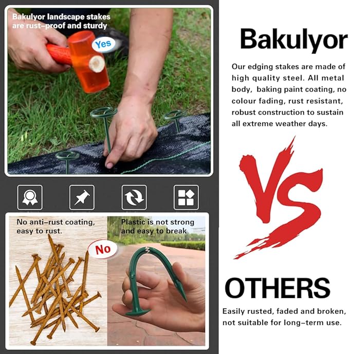 • High Quality Materials - We use 9 gauge (3.8mm) high quality steel to manufacture these garden pegs. These metal garden pegs are suitable for all kinds of soil, won't bend and break, and are stronger than plastic pins. The surface is weather-resistant baking paint, which is more durable than raw iron nails on the market, won't rust and crack even after years of use and can be reused, saving you money.
