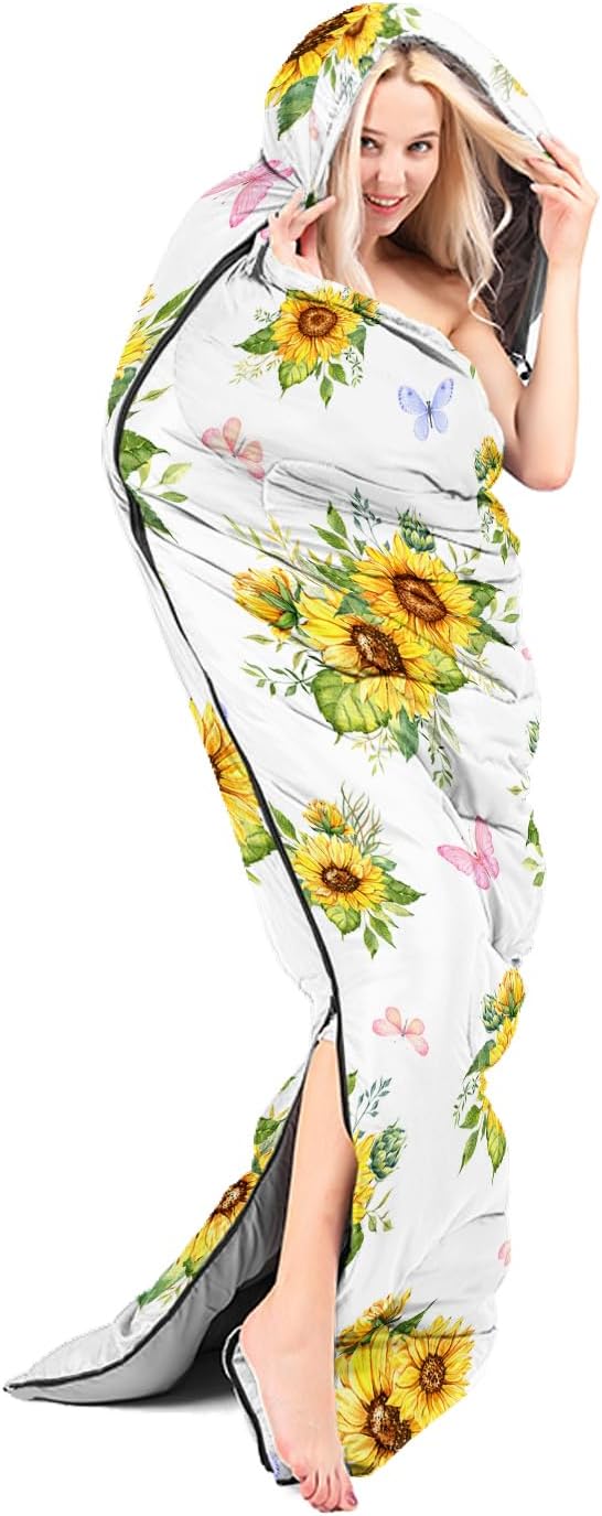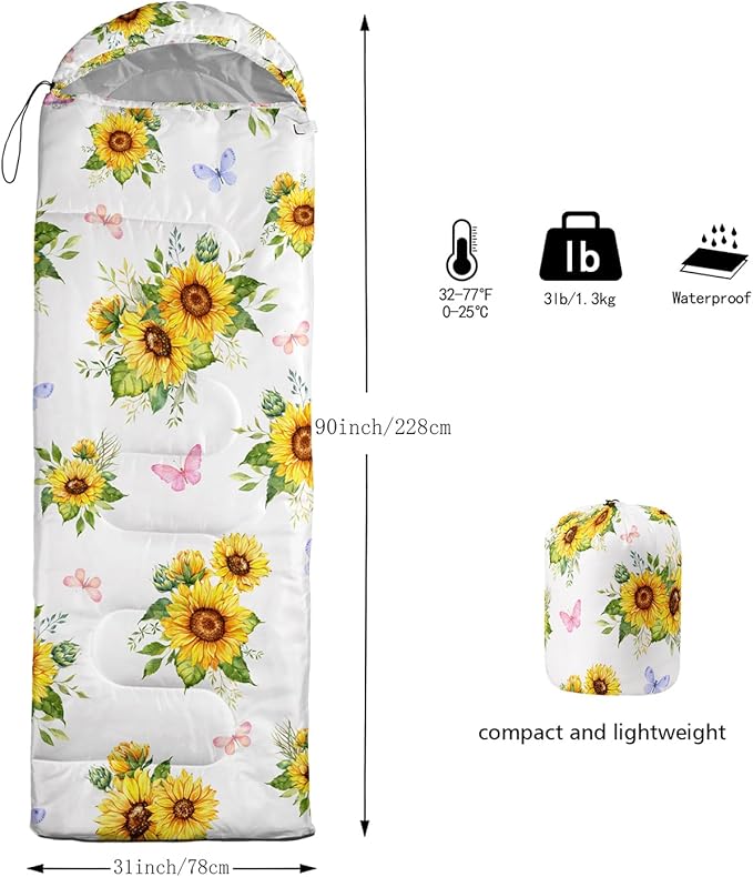 • Sunflower Great For All Seasons- Our camping sleeping bags are designed to give you a good night's sleep. Ideal for spring,summer,fall,and winter,rated from 32°F to 77°F (optimal comfort temperature is 50°F to 65°F). Stay comfortable and warm in any condition at normal altitude. Can be used for any outdoor adventure,class camping,summer camps,couch surfing,indoor blanket,and as an emergency blanket for vehicles.