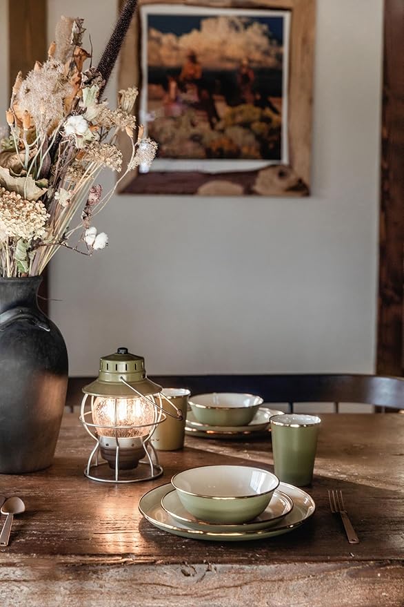 • Classic and Stylish: The new 2-tone enamelware features a smooth and speckled, enameled white interior that guards against food stains, paired with a textured matte olive drab exterior, providing superior grip and resilience. The signature bronze-like stainless steel rim adds a sophisticated touch