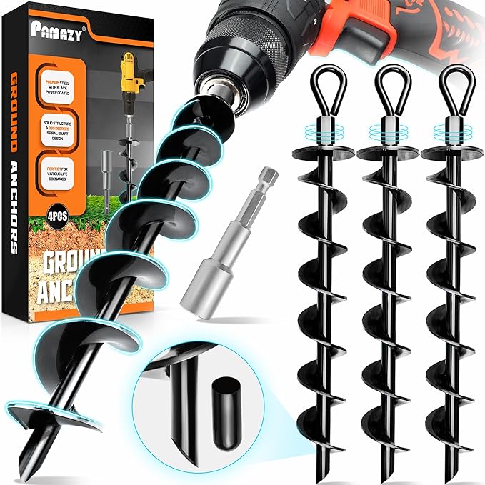 • [Ensure Your Convenience] You will get not only 4 ground anchors which are 15 inches long with detachable eyelets, but also a power nut driver for connecting with the drill. Each ground anchor has a cover to protect the sharp tips, providing better safety while moving. Our ideal ground anchor set, swing set anchors, trampoline stakes, tent stakes heavy duty, playset anchors, or as anchor shed augers - greatly improve your experiences.
