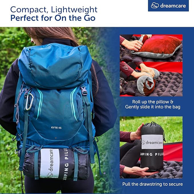 • Lightweight and Compact - Dreamcare Camping Pillow's lightweight and compact design makes it easy to carry around on all your adventures. It easily rolls up to fit into the included water-resistant bag, making it a great addition to you camping accessories. After unrolling the pillow, simply shake it out so that the memory foam spreads out evenly.