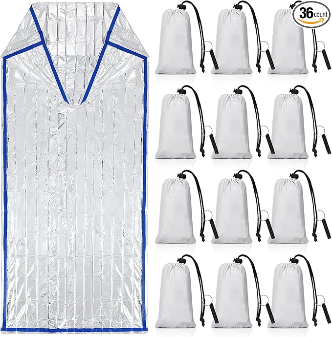 Qunclay 12 Set Emergency Sleeping Bag Survival Bivvy Sack Blanket with Whistles Lightweight Portable Thermal Survival Bag Thick Tent with Hood Extension Nylon Stuff Sack