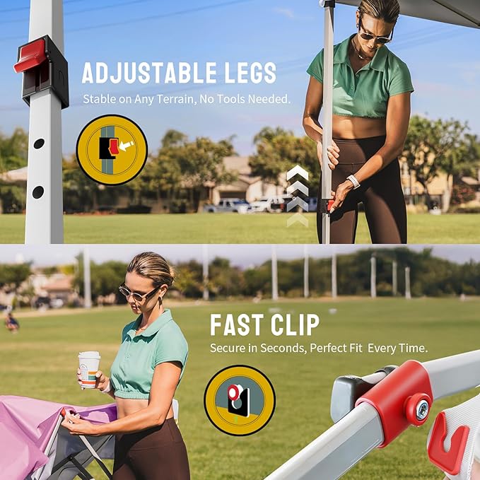 • FAST CLIP CANOPY FABRIC - The new clip system easily attaches the canopy fabric to the frame. The silver-coated interior provides UPF 50+ UV protection, ensuring cooler and safer shade. Made from rugged 150D fabric, the pop up tent is water-resistant and flame-resistant (CPAI-84). Integrated air vents and the Fast Clip system prevent wind lift and rain pooling, reducing fabric tearing risks. This innovative design is ideal for outdoor events and gatherings
