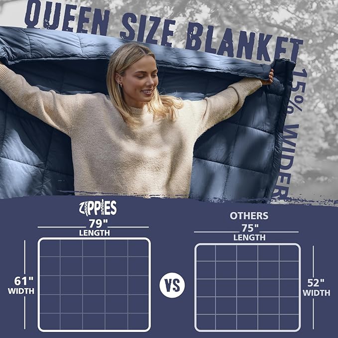 • Discover Cozy Bliss with ZIPPIES Puffy Blankets: Unwrap our 79" x 61" packable blanket and slip into a plush haven of warmth and comfort. Perfect for stargazing campouts, park picnics, or cozy movie nights at home, this sleeping bag blanket wraps you in snug delight. Connect multiple ZIPPIES with a simple zip to craft a larger blanket—great for couples, families, or group adventures. Paired with a compact 16" x 7" storage bag, it’s your portable ticket to comfort wherever you roam.