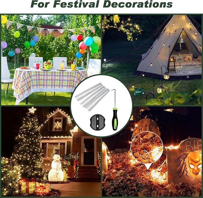 • 【MULTI PURPOSE】A very useful tool for outdoor activities. It can be used for Christmas decoration, Halloween lights stakes, yard, garden, lawn. Help you to fence in dogs, squirrels, rabbits. Help you to fix edging,plant roots, weed barrier landscape fabric or plastic, fences, hoses to keep your garden clean and tidy.These ground stakes hold plastic gaskets for Halloween Display as well as anchoring light strands and tombstones and other items.