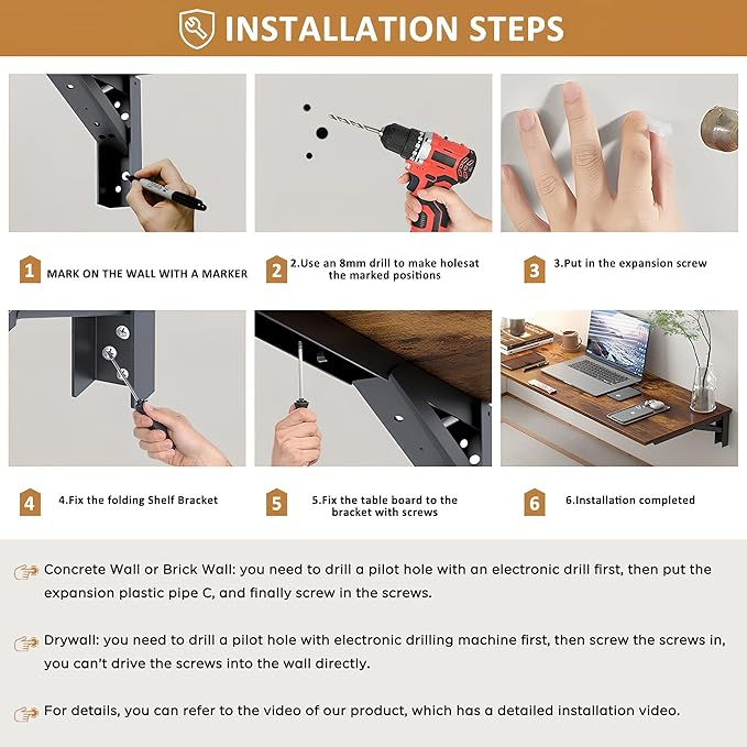 • ★STURDY & SIMPLE -Sturdy, well-balanced, and timeless. The the small wall desk can hold up to max 220 lbs . And the top surface is 3/4 inch thick, high resistance on scratch & friction.According to the instructions, step by step installation is correct, no matter whether the reinforced concrete wall or drywall are very sturdy.