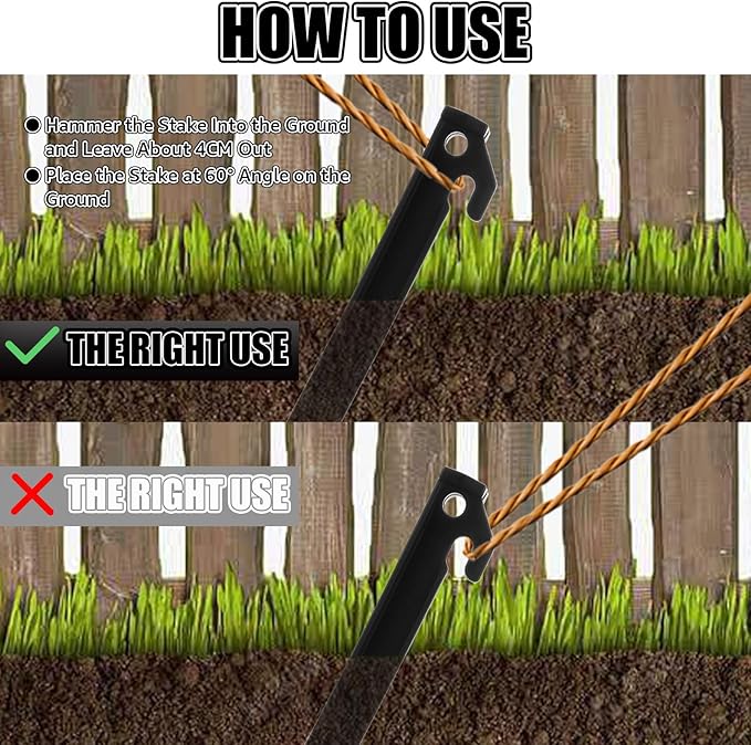 • EASY TO USE: You just need to insert the heavy duty tent pegs into the ground at a suitable Angle, and then tie one end of the nail to the peg with a rope, and the other end to the corner of the tent, so that the various parts of the tent can be firmly fixed, easy to disassemble, and not easy to fall even if the wind is strong
