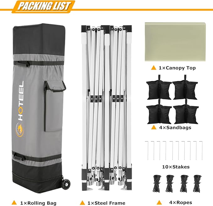 • 【Packing List】 1x 10x20 Commercial pop-up canopy frame, 1x 10x20 canopy top cover, 4x Oxford cloth Sandbags, 10x Ground Pegs, 4x Ropes, 1x Wheeled Bag, 1x Manual. We offer one year after-sale garantee for canopy frame, six months after-sale garantee for fabrics and accessories. If there is any questions, please feel free to contact us through the help page.