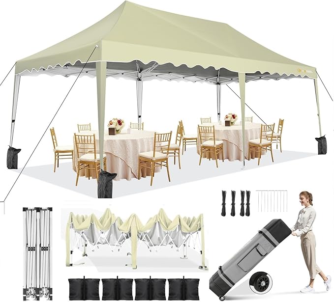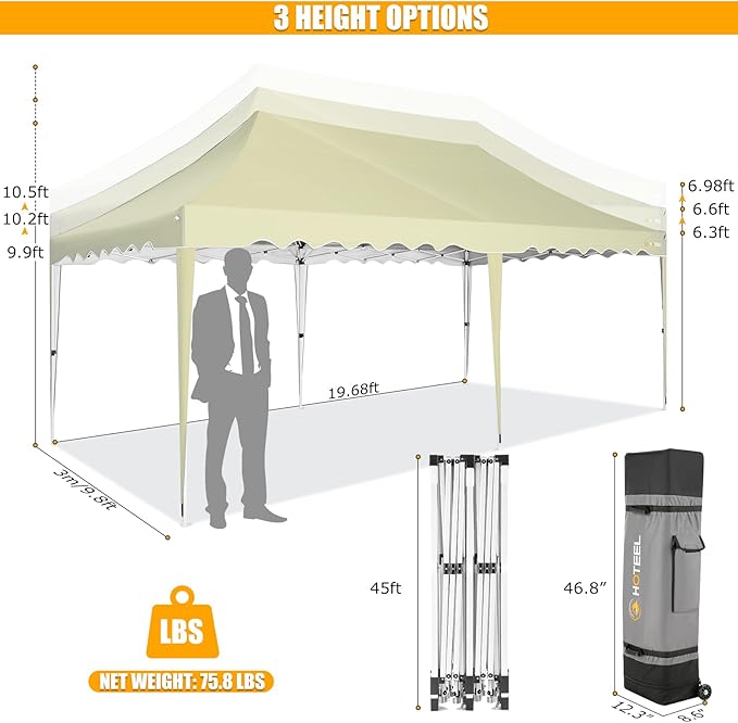 HOTEEL 10x20 Pop Up Canopy, Outdoor Easy Setup Party Tent, Waterproof Portable Enclosed Event Shelter with Wheeled Bag, Weight Bag for Backyard, Vendor, Khaki