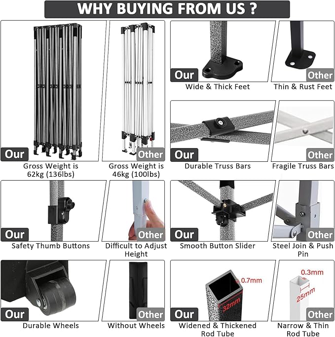 • 【Packing List & After-sale Protection】Pop up canopy 10x30 tent Top Cover x 1, Pop Up Canopy Frame x 1, Sidewall with Zipper x 3, Sidewall with Window x 5, Sandbag x 4, Ground Nails x 4, Ropes x 8, Wheeled Storage Bag x 1. We have a professional service team and provide 24/7 customer service to help you with any questions or queries you may have while using COBIZI products. One year after-sale protection for the canopy frame; Six months after-sale protection for fabrics and accessories.