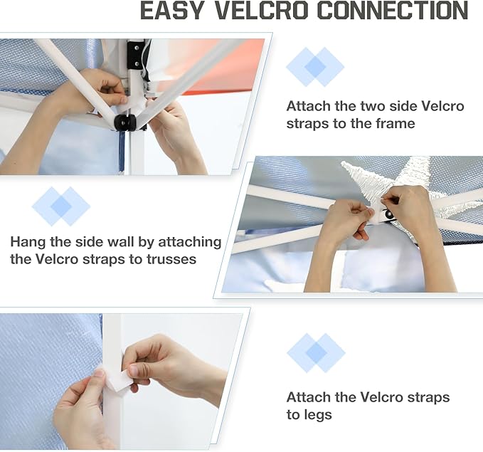 • REMOVABLE SIDEWALL: This outdoor canopy includes one detachable sidewall that secures to the frame with durable, extended Velcro straps. The 150D silver coated oxford canopy top is water resistant, offers UV protection, and meets CPAI-84 fire resistance standards. Enjoy reliable sun shelter and weather protection with heavy duty fabric designed for comfort and safety.