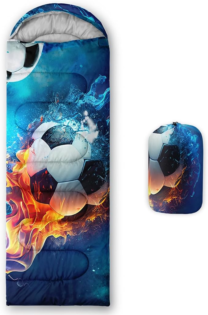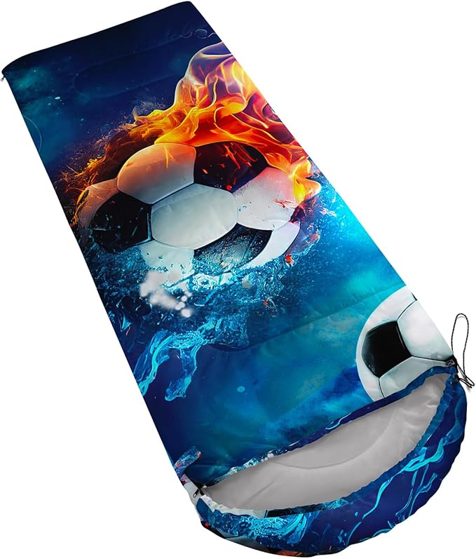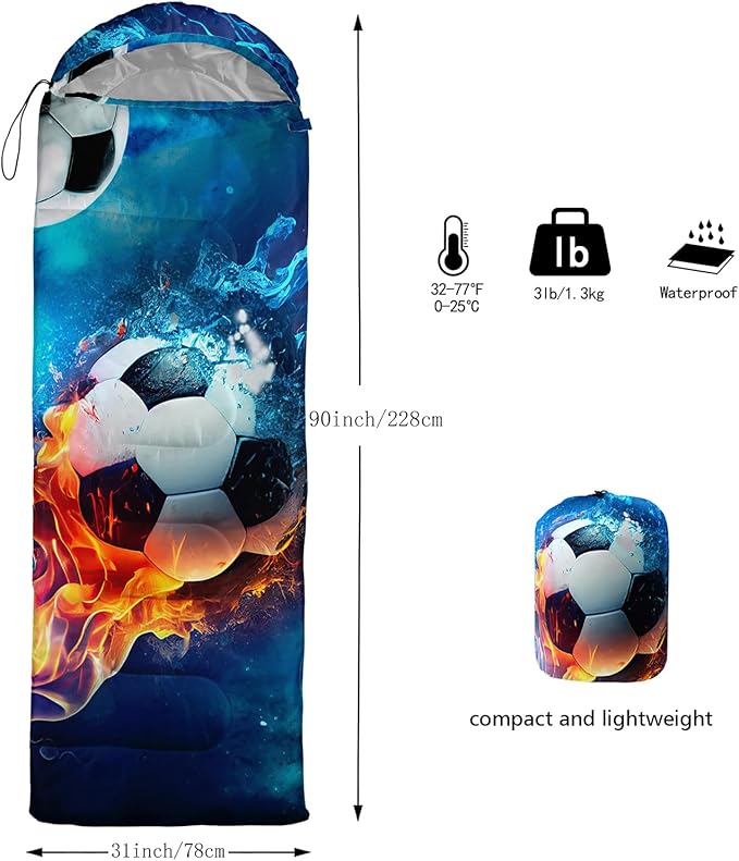 • 【Fits For 3 Seasons】: Size - 31 by 90 inches (W x D). Our Ice Fire Football sleeping bag can be used in 3 seasons with a design temperature of 32℉-77℉(0℃-25℃). These Ball Sports bags also have a weather resistant waterproof design to keep you warm and prevent you from any dampness.