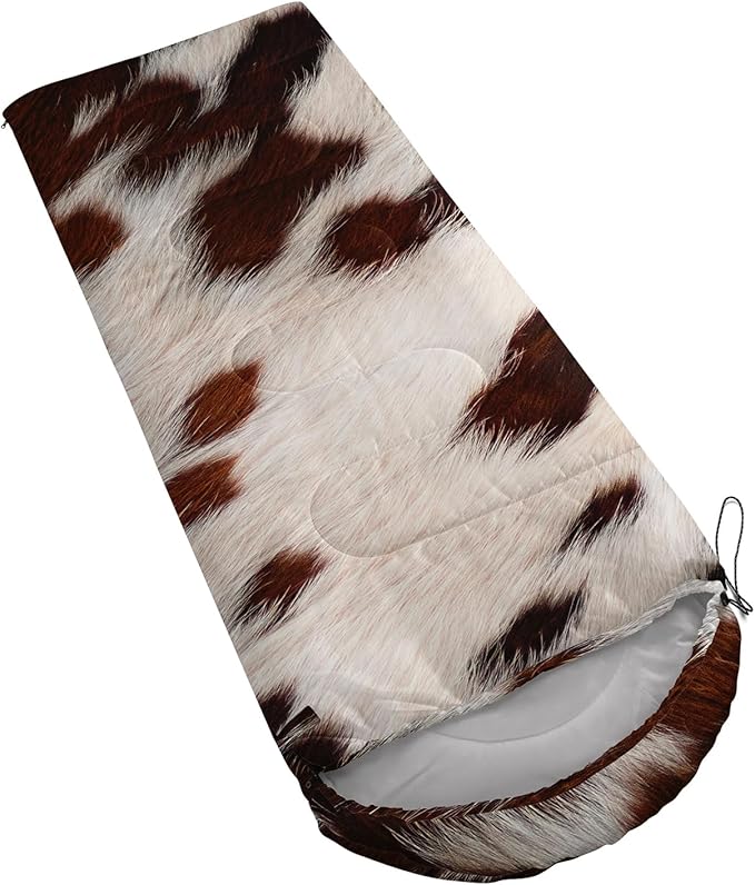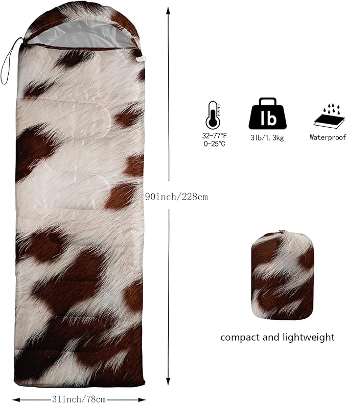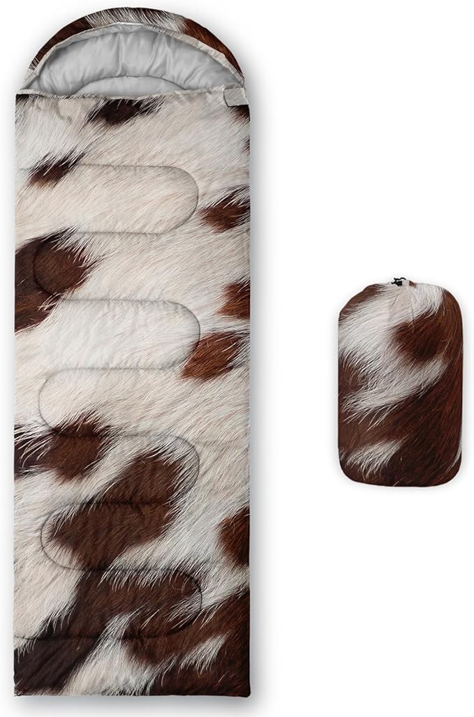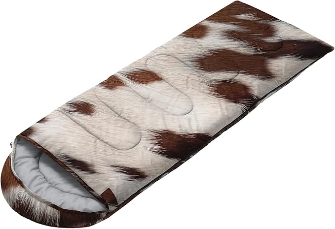 • Cow Print sleeping bags For All Seasons- Our camping sleeping bags are designed to give you a good night's sleep. Ideal for spring,summer,fall,and winter,rated from 32°F to 77°F (optimal comfort temperature is 50°F to 65°F). Stay comfortable and warm in any condition at normal altitude. Can be used for any outdoor adventure,class camping,summer camps,couch surfing,indoor blanket,and as an emergency blanket for vehicles.