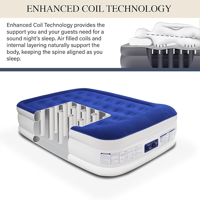• King Koil Full Size Air Mattress Provides Luxury Comfort with Built-In Pillow & 1-Year Warranty: Experience exceptional sleep on our King Koil 20" full double high airbed. Featuring a plush, built-in pillow, luxurious pillow top, soft flocking layer, and advanced coil-beam construction, this airbed is engineered with durable, waterproof, and puncture-resistant materials to ensure a restful night’s sleep.