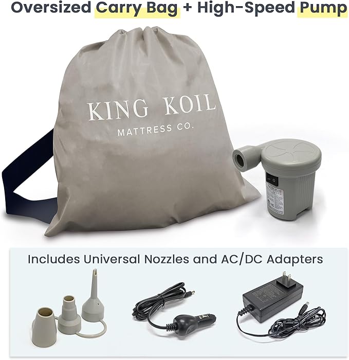 • YOUR TODDLER WILL THANK YOU: Make family travel more comfortable with the Toddler and Kids Travel Bed by King Koil, This inflatable kids’ bed provides a cozy sleep solution for kids during vacations, at babysitters, or on camping trips, ensuring a good night for everyone, Includes an oversized travel bag and electric pump with AC/DC adaptors for easy and convenient use