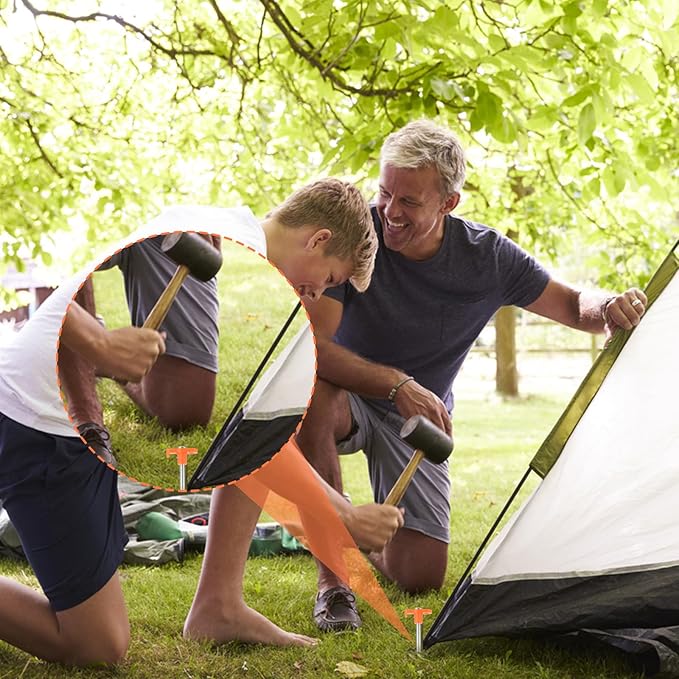 • Strong Material - Our metal tent stakes are made of high quality heavy duty galvanized iron, strong, durable and rustproof. The orange tops are made of thickened plastic material, which is not easy to break and can be used for a long time in different climates.