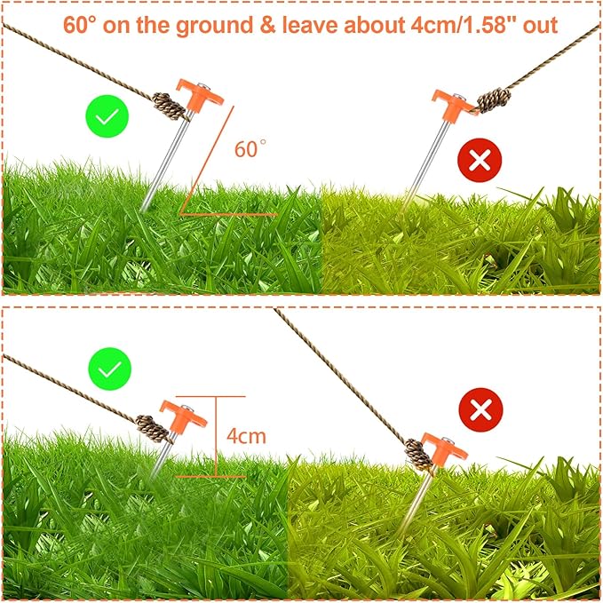 • Firmly Fixed - The ground stakes should be inserted into the ground at a 60-degree angle, not at a 90-degree angle to the ground, reinforcing firmness and resistance to strong winds. It is a professional tool for fixing tents, canopies and tarps.
