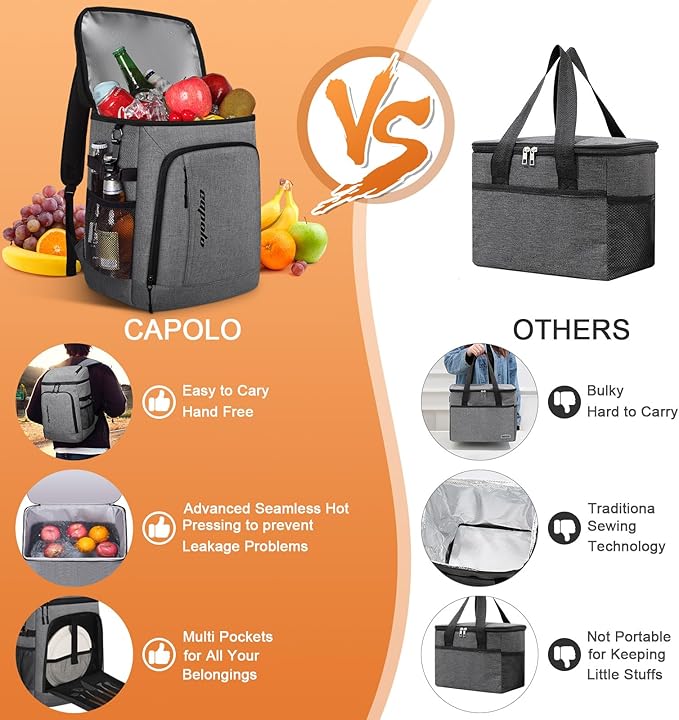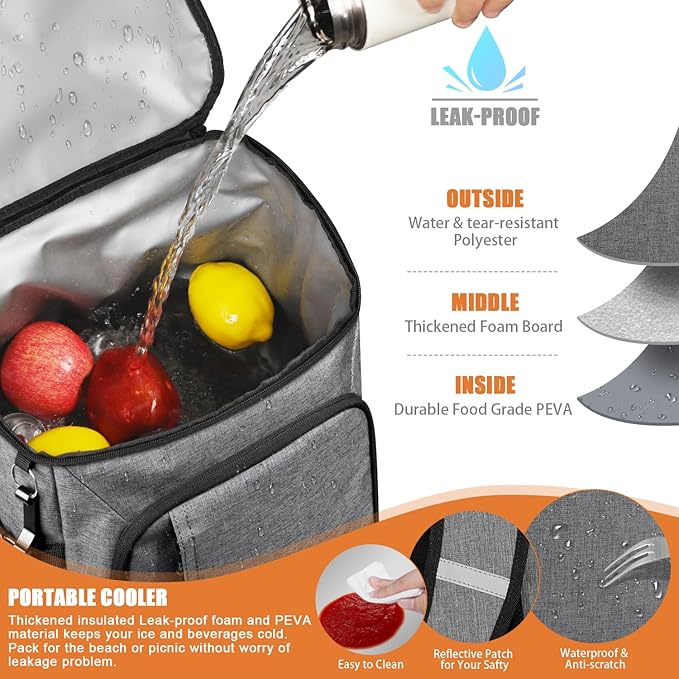 • INSULATED CAMPING COOLERS - What troubles can this insulated backpack cooler solve for you? Yes, it can provide a long-term preservation that keep your beverages and food cold/hot. Warm tips: adding ice cubes/packs while using our leakproof cooler backpack to keep bevarages cold longer.