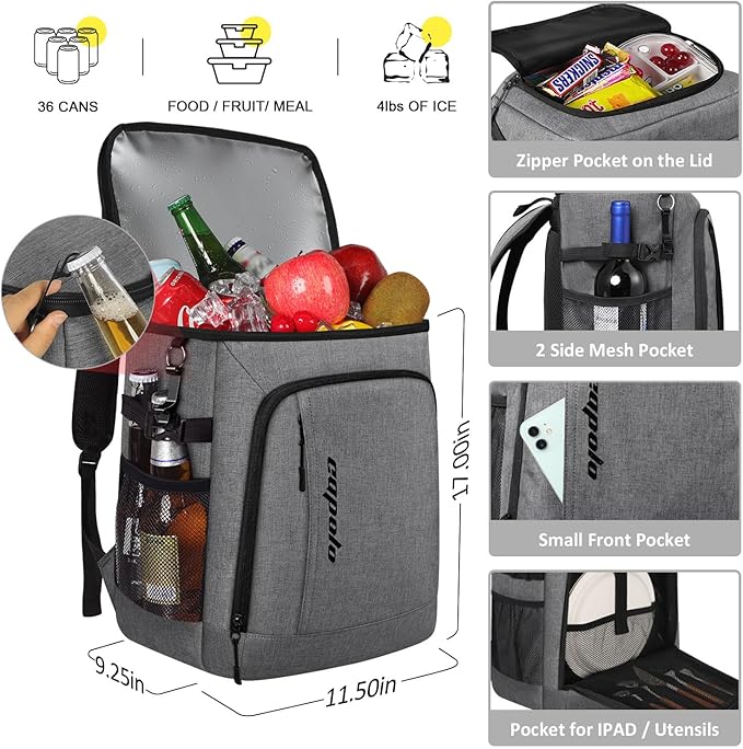 • LARGE CAPACITY & ORGANIZER - Capolo ice chest cooler bag holds up to 36 cans(355ml), enough space for all your necessities. Except for the roomy insulated main compartment for food and beverages, we have 2 side mesh pockets, 2 large front pockets and 1 zipper pocket on the lid for easy organization of snacks, tissues, utensils, cell phone, wipes and other small items.