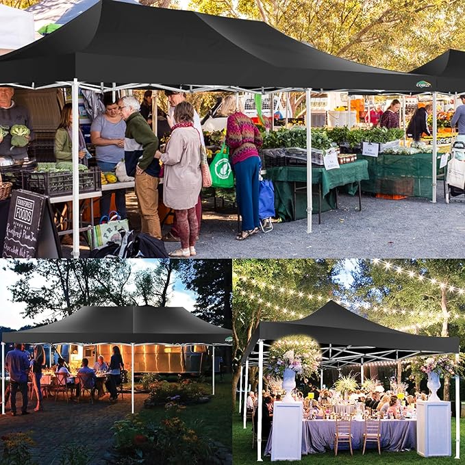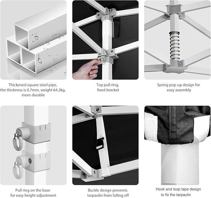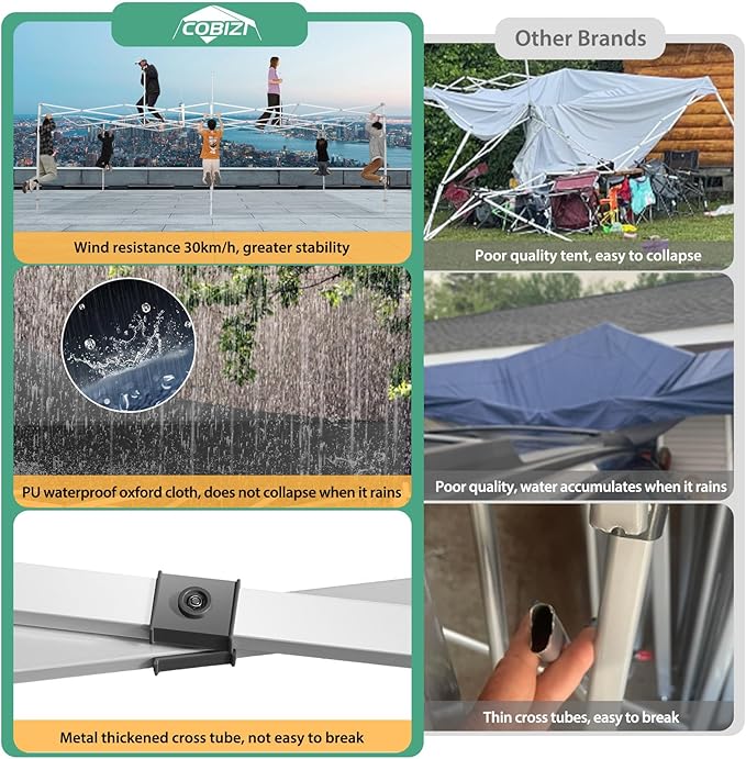• 【2 Heights Setting】Canopy tent outdoor gazebo tent for parties 13x26 have 2 height settings . You can quickly and easily adjust two height positions by simply pulling the button outward: 231cm/90.9in, 238cm/93.7in, no tools required. COBIZI easy pop up canopy tent have upgraded buttons, which are easy to lock and release, adjust to avoid clamping your hand and be safer.