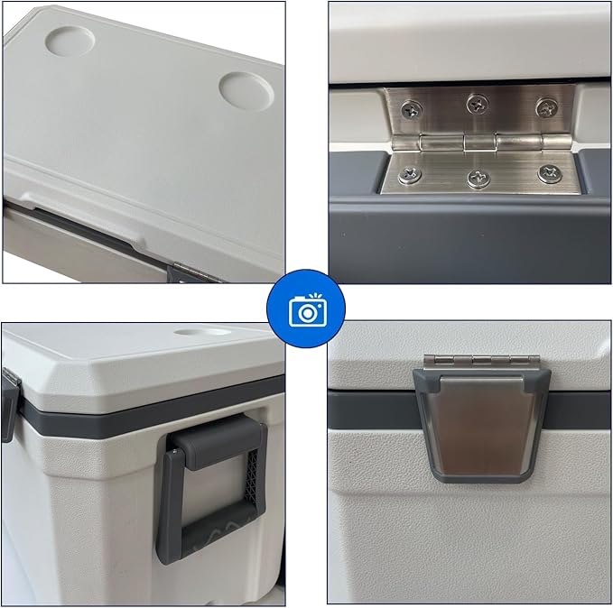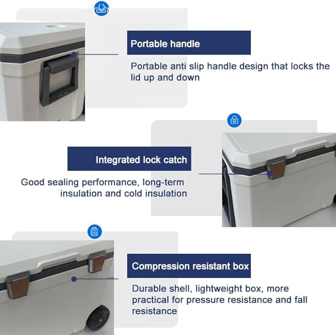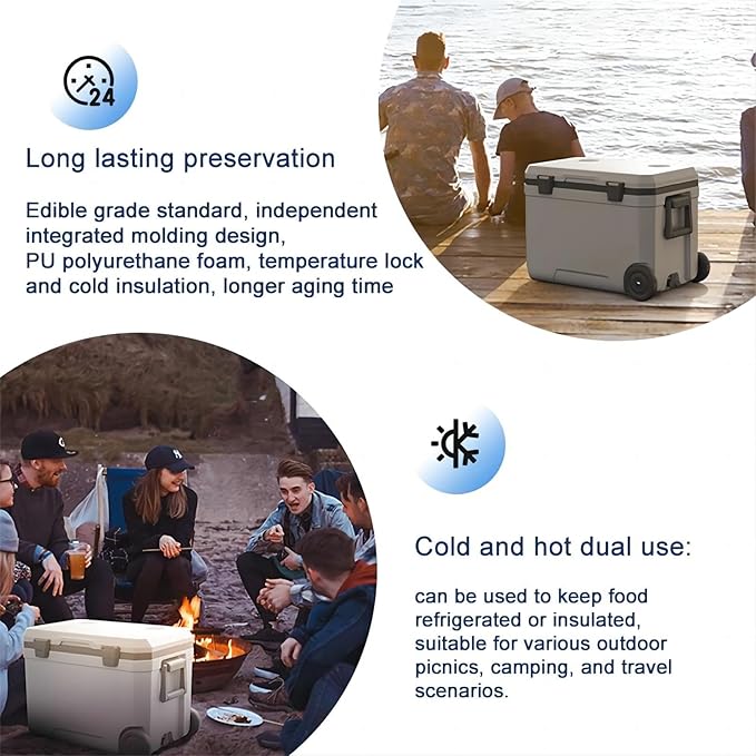 • 3. Product details: The thickened box makes the box more sturdy, with 2 anti slip rubber handles and 1 anti slip pull rod, which conforms to ergonomic principles and helps with easier movement. The drain outlet makes it easier for you to invert the water in the cooler.