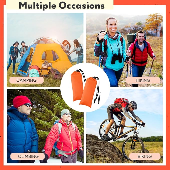 • Foldable and Portable: with a lightweight of around 2.8 ounces/ 80 g, these camping bivy sacks are easy to carry and store, plus, they come with a foldable design that fits neatly in the drawstring bags for reusable; They will not occupy much space in your pack, making them a convenient tool in your trips or emergency kit; And the whistles can be attached to the drawstrings