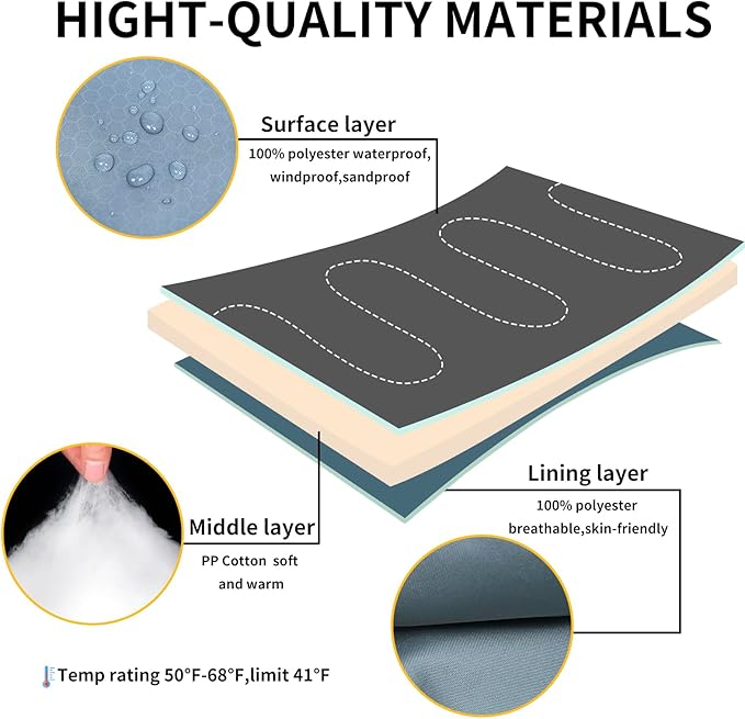 • Comfortable Sleeping Experience:Our sleeping bag can be used in 3 seasons with a design optimal comfort temperature of 59℉,temp rating 50°F-68°F.This lightweight sleeping bag is perfect for weather camping trips in Spring through to Autumn.Give you a comfortable sleep after a day of adventure outdoor camping, backpacking, hiking, and outdoor travel.