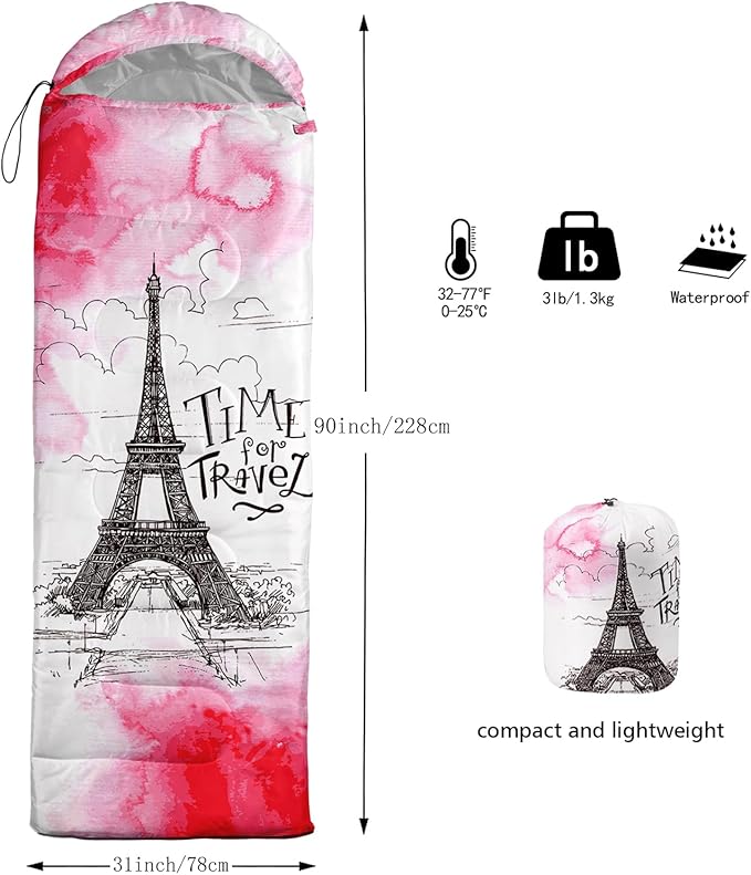 • 【Fits For 3 Seasons】: Size - 31 by 90 inches (W x D). Our Paris Architecture sleeping bag can be used in 3 seasons with a design temperature of 32℉-77℉(0℃-25℃). These Sleeping bags also have a weather resistant waterproof design to keep you warm and prevent you from any dampness.