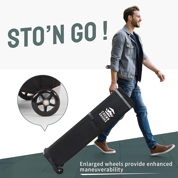• CONVENIENT ROLLER BAG: This 10x20 pop-up canopy comes with a bag that has 4-inch wheels for easy mobility, featuring a spacious opening and a sturdy pull handle. The convenient pocket design can store 4 stakes and 4 ropes, making this canopy an ideal choice for any outdoor event