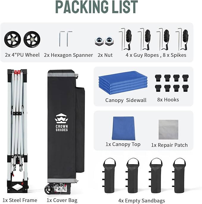 • CONVENIENT TRANSPORT & STORAGE: With a weight of just 48.5 lbs and the Sto'N Go bag featuring 4” enlarged wheels, this canopy is easy to transport and maneuver. Comprehensive accessories included for a complete setup experience.