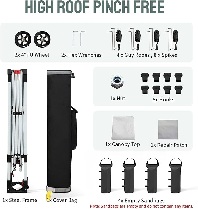• DURABLE AND STRUDY FRAME - The canopy with sidewalls has been upgraded with a metal frame and leg tubes that are 1.2 times larger in cross-sectional area compared to other outdoor canopy, ensuring stability and durability. Equipped with 4 sandbags, it can withstand strong winds. The legs can be adjusted to 4 different heights using pinch-free buttons, and 8 hooks are included for hanging lights, signs, and more, suitable for commercial and professional events such as business activities.