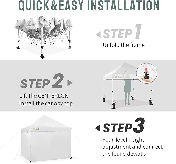 CROWN SHADES Pop Up Canopy Tent, 8x8 Commercial Canopy Tent with 4 Sidewalls, 4" Wheels, 4 Upgraded Weights, Patented Centerlock, 400D Fabric, Sto'N Go Bag, White