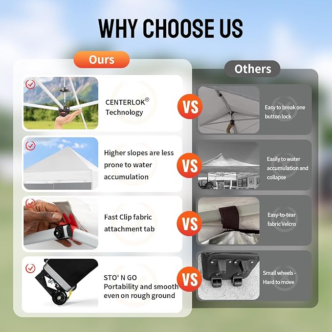 • COMPLETE PACKAGE - Includes an 8x8 size canopy tent frame with Centerlock Tech, an 8x8 size fabric top, 4 detachable side walls, and a patented Sto 'N Go Cover Bag. Accessories include 4 weight bags, 4 guy ropes, 8 spikes, and 2 hex wrenches, 8 hooks, ensuring stability even in windy conditions.