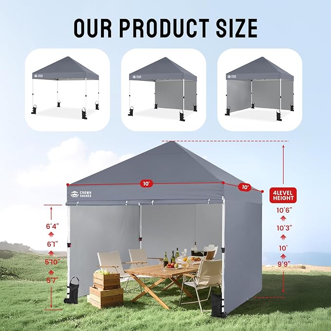 CROWN SHADES 10x10 Pop Up Canopy Tent Instant Commercial 1-Person Setup Patended Centerlock with 400D Fabric, 4 Sidewalls, 4" Wheels, 4 Upgraded Weights, Sto'N Go Bag, Gray